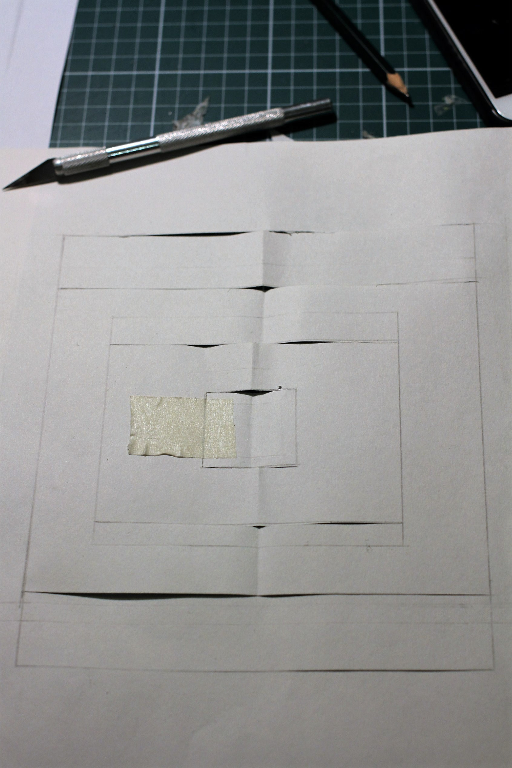 In this works, I used line area and positive & negative elements. The one line inside, and next line in outside. the cube in middle. This make contrast. and the middle folded in half. The light exposure from right sides, also create light and shade contrast.