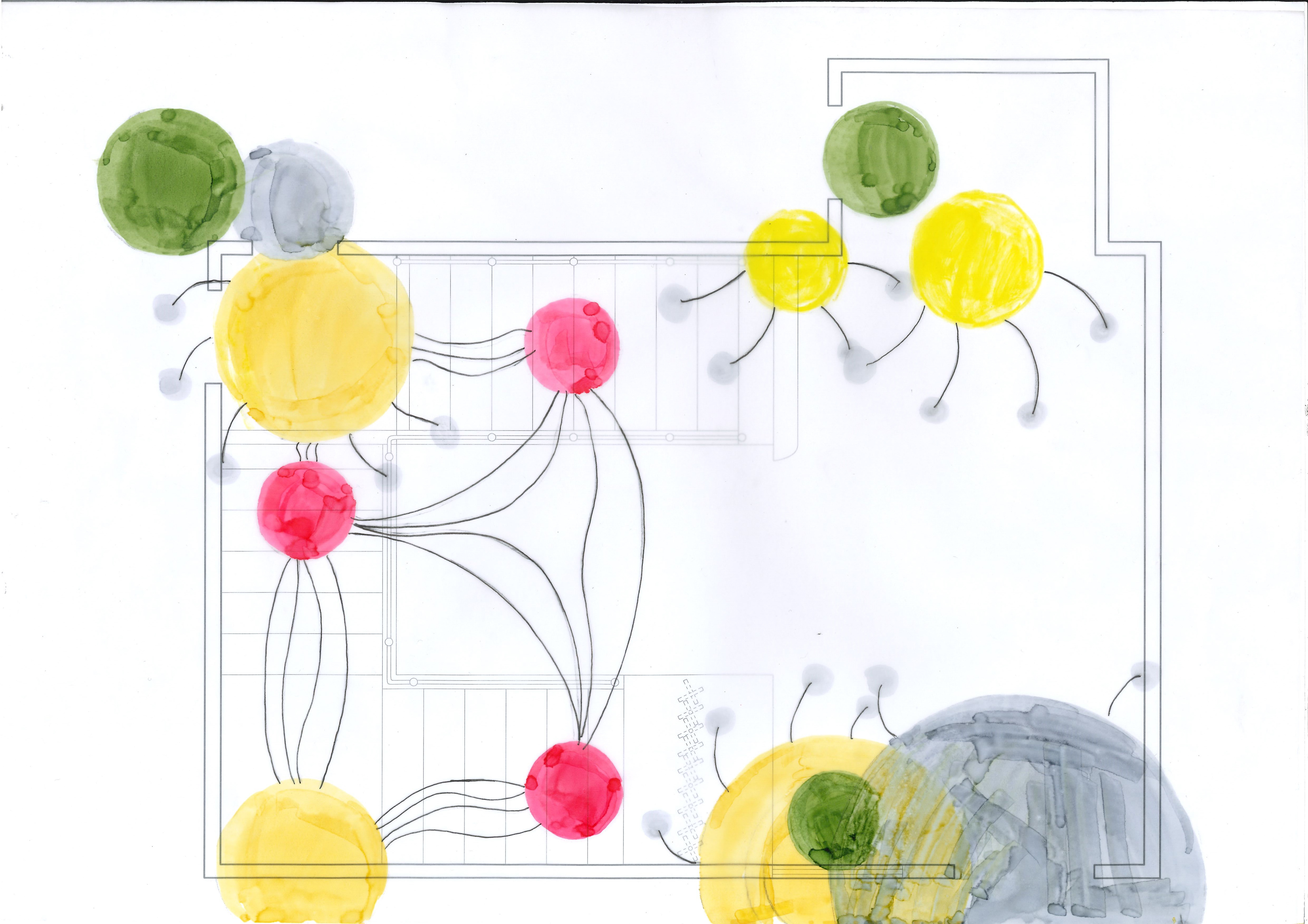 I used different scale and colour circles to show hierarchy in drawing B. Yellow representfrequently visited, entrace, elevator and stairs.different size means different density. I also used lines to show connection and movement.